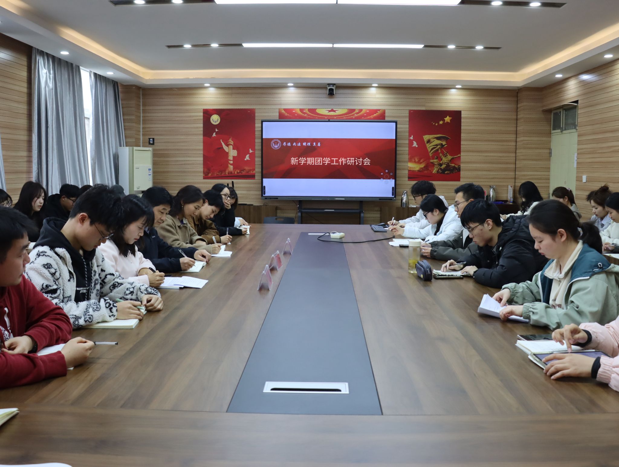 在博识楼3424会议室召开新学期团学工作研讨会。韩国av党委书记许文、党委副书记张翠华、团委副书记周静及团委学生会全体工作人员参加会议。会议由周静主持。